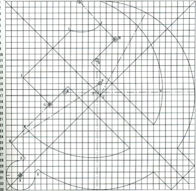 1 將一正方形分為32等分,分格線條編號為橫向1~33,豎向1′~33′。畫出對角線AC、BD。